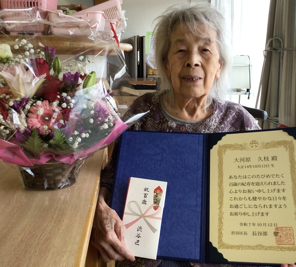 本日、渋谷区より担当者の方が、今月100歳を迎えられたご利用者に、フラワーアレンジメントと賞状、お祝い金をお持ちくださいました。ご本人は大変喜ばれ、感謝されていました。